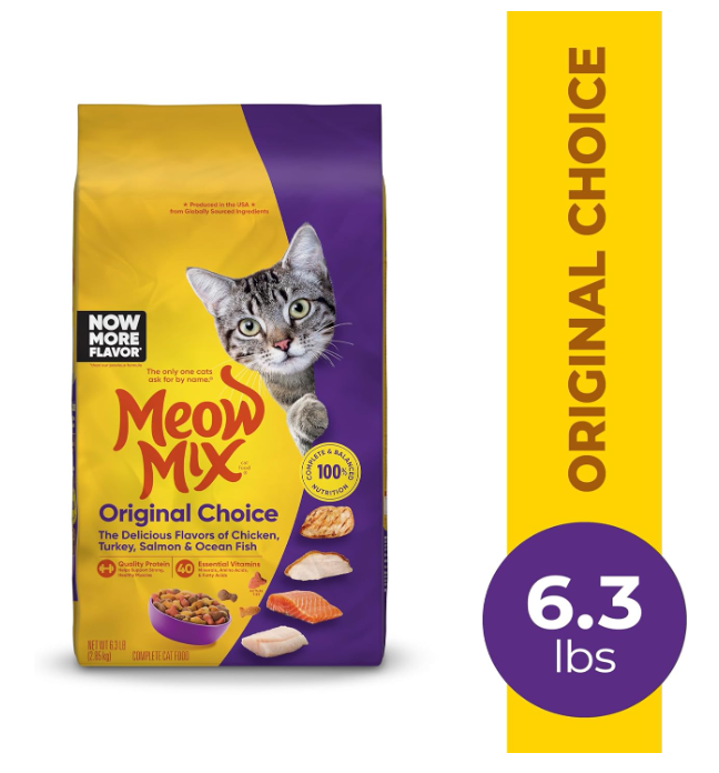 Give your cat the delicious taste they crave and the nutrition they need with Meow Mix Original Choice Dry Cat Food. Made with real chicken, turkey, salmon, and ocean fish, this 6.3 lb bag is packed with flavor that keeps cats coming back. It provides 100% complete and balanced nutrition for adult cats, including 40 essential vitamins, minerals, amino acids, and fatty acids. With high-quality protein to support strong muscles and antioxidants for a healthy immune system, this dry cat food supports energy, health, and happiness in every bite. Perfect for daily feeding, Meow Mix is the trusted choice for cat owners across the USA.